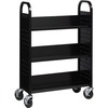 Single-sided book cart offers three slanted shelves where you can organize and transport your books and other items. The opening between each shelf measures 12". Sturdy sturdy design features smooth, rounded handles for easy maneuverability and perforated end panels for style and better air circulation. Cart moves easily on 5" casters that all lock for when you need the cart to stay put. Welded steel construction provides a long-lasting, durable product.
